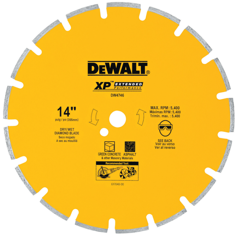 14" Extended Performance Asphalt / Green Concrete Segmented Diamond BladeThe DeWalt 14" extended performance asphalt / green concrete segmented diamond blade is an extremely durable and useful attachment. Use this to increase your efficiency and decrease your work time. Superior build quality means you will be using this bit for years with minimal wear and tear. A must have for any professional or do-it-yourselfer. Features: Extended performance diamond matrix provides 350x s the life of conventional abrasives and enhanced material cutting Segmented rim blades are laser welded with heat treated steel bodies which provides increases durability and long life Large diamond segments with cobalt is ideal for use across various product applications Specifications: Diameter: 14"Edge Thickness: .125"Segment Height: 7 mmArbor Size: 1, 20mm"Application: Asphalt or Green Concrete CuttingMax rpm: 5400DEWALT is firmly committed to being the best in the business, and this commitment to being number one extends to everything they do, from product design and engineering to manufacturing and service. Reviews the DeWalt DW4746 14-Inch Segmented Rim Asphalt/Green Concrete or similar products